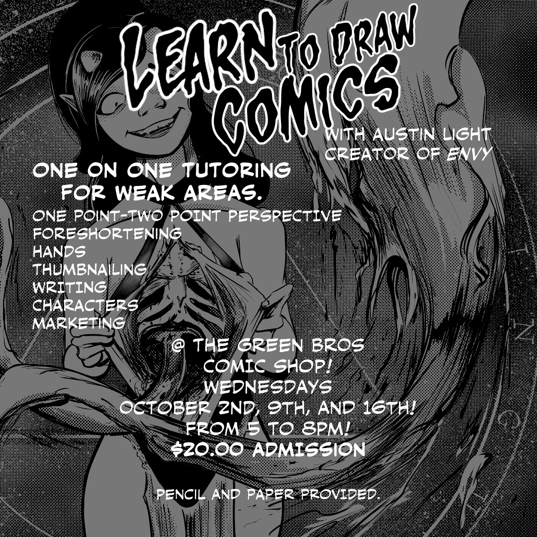 And last, I will be teaching at the Green Bros Comic Shop for the next three Wednesdays! I may be an amateur but I have learned an absolute metric tone of how-to when it comes to comics and art in general. (Guys, I have a degree in this stuff after all!) So if you’re local, I’ll be happy to help in any way that I can. Here are the deets: